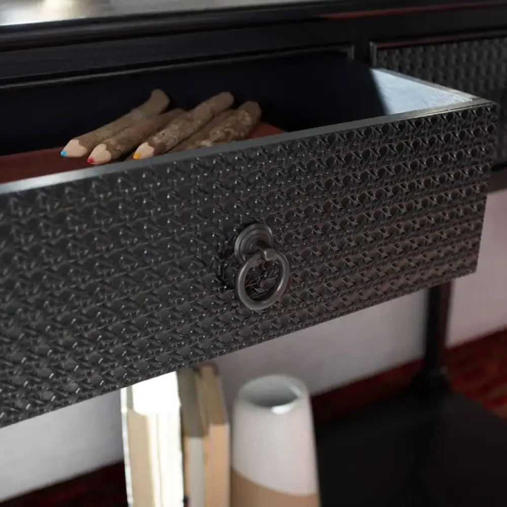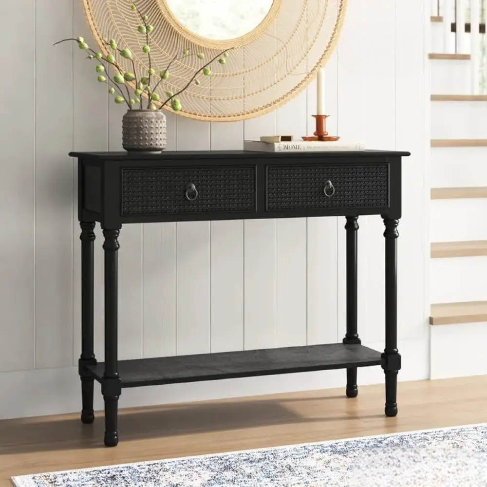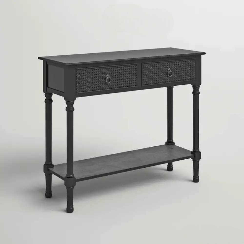This console table streamlines your hallway or living room with storage and a classic, clean-lined design. It’s crafted from solid and engineered wood with a weathered finish that complements your coastal farmhouse aesthetic, and it rests on turned legs. This table features two drawers with hideaway space for chargers, keys, or any clutter that needs tucking away before the company comes over. The lower shelf has an open construction that holds shoes and storage baskets in one spot. We love how the textured drawer fronts and antique-inspired ring pulls complete the breezy look of this console table.